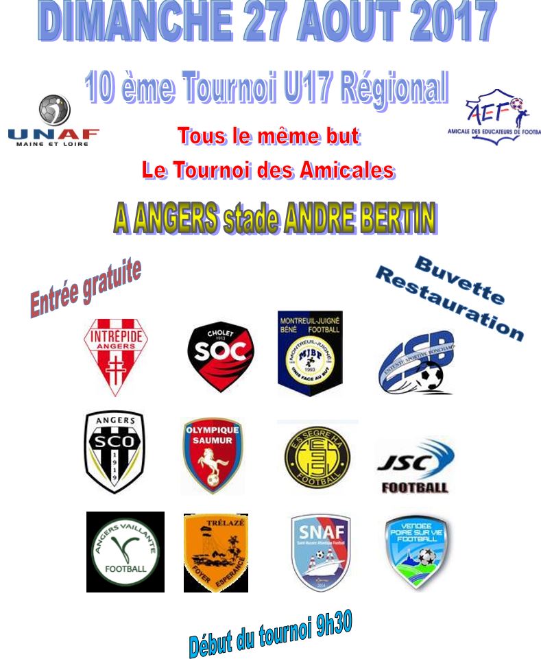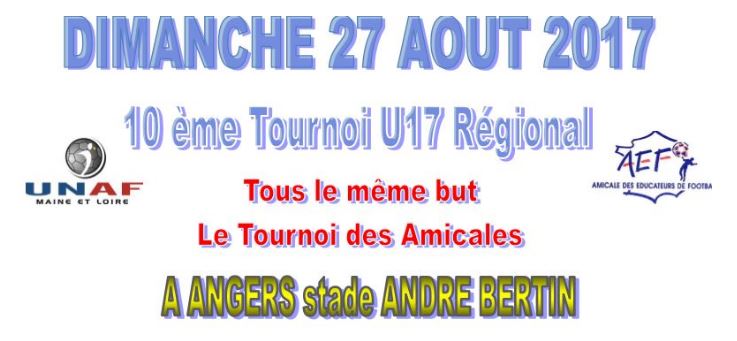 L’Amicale des Educateurs de Football (AEF) et l’Union Nationale des Arbitres de Football (UNAF) du Maine-et-Loire organisent la 10ème édition du tournoi « Tous le Même But » le Dimanche 27 Août 2017 au Stade André Bertin à Angers.