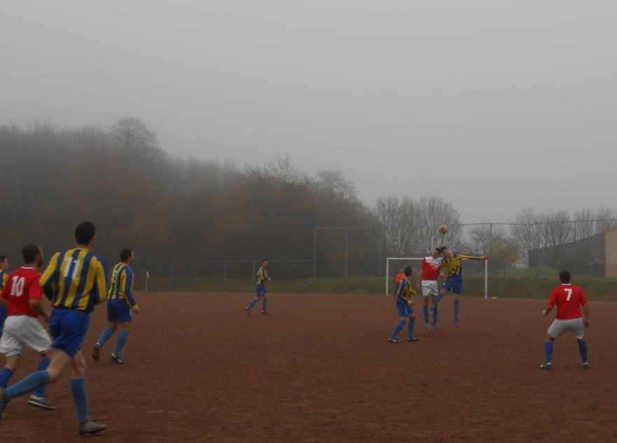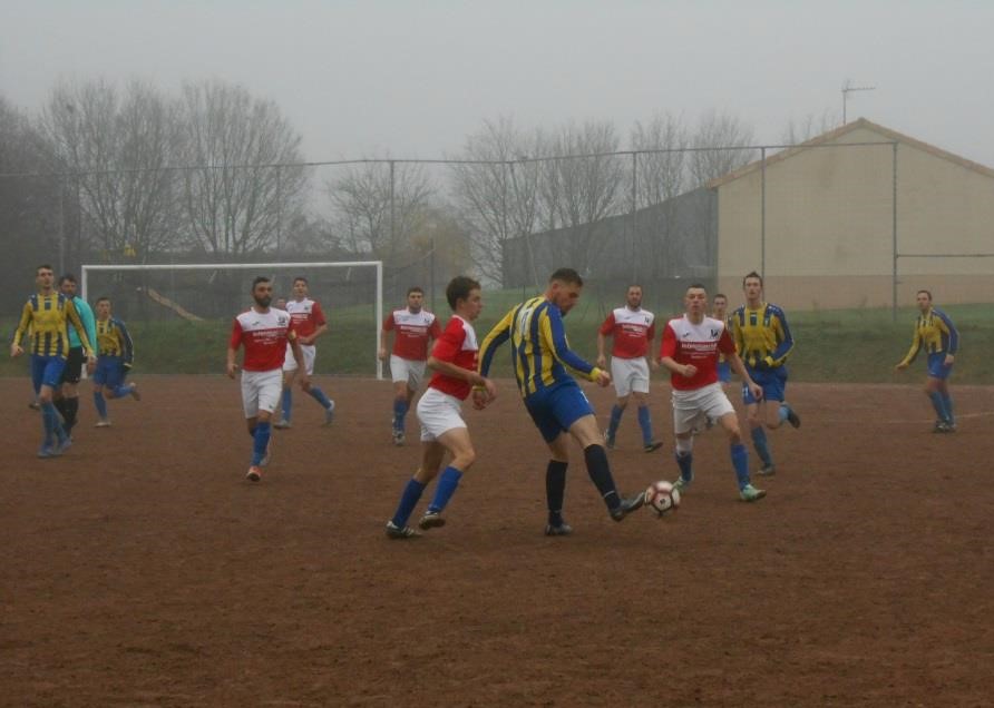 « Le match s’est déroulé sur un terrain stabilisé. Le début du match est plutôt à l’avantage de la Salle Aubry. Ils se montrent dangereux sur des coups de pied arrêtés, mais par deux fois, les têtes ne sont pas cadrées, puis nous arrivons à jouer plus haut et à notre tour, nous nous montrons dangereux par deux fois, Flavien Champiré ne cadre pas ses têtes. Alors que nous sommes sur un temps fort en notre faveur, sur un long ballon notre défenseur, Élie Vitour apprécie mal le rebond et fait une main juste devant la surface. La Salle Aubry ouvre le score sur ce coup franc légèrement excentré, le ballon contourne notre mur, touche le poteau et rentre (1-0, 15e). Nous reprenons l’ascendant dans le jeu, même s’il est très difficile de jouer sur ce genre de terrain. Ce n’est pas du grand football et après quelques cafouillages dans la surface de réparation, nous mettons notre adversaire en difficulté, mais sans réellement inquiéter le gardien de but adverse. A la 30e minute, Steven Lelarge est taclé irrégulièrement dans la surface, l’arbitre accorde un penalty que Flavien transforme (1-1, 30e). Le dernier quart d’heure est plutôt à notre avantage et Steven à l’occasion de nous faire passer devant, mais sa frappe lobée passe au-dessus du cadre. Puis, une frappe de Flavien est stoppée difficilement par le gardien. Mi-temps 1-1.