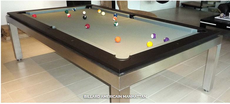 Disponibles dans différentes dimensions et avec un large choix de coloris de draps, nos tables de billard américain s’harmonisent parfaitement à votre intérieur. Selon votre préférence, nous pourrons vous proposer pour la récupération des billes un tiroir centralisateur avec rails, ou une descente intérieure située sous la table de billard. Et, bien sûr, tous nos produits peuvent être transformés en tables de billard français grâce à l’option table de billard transformable.