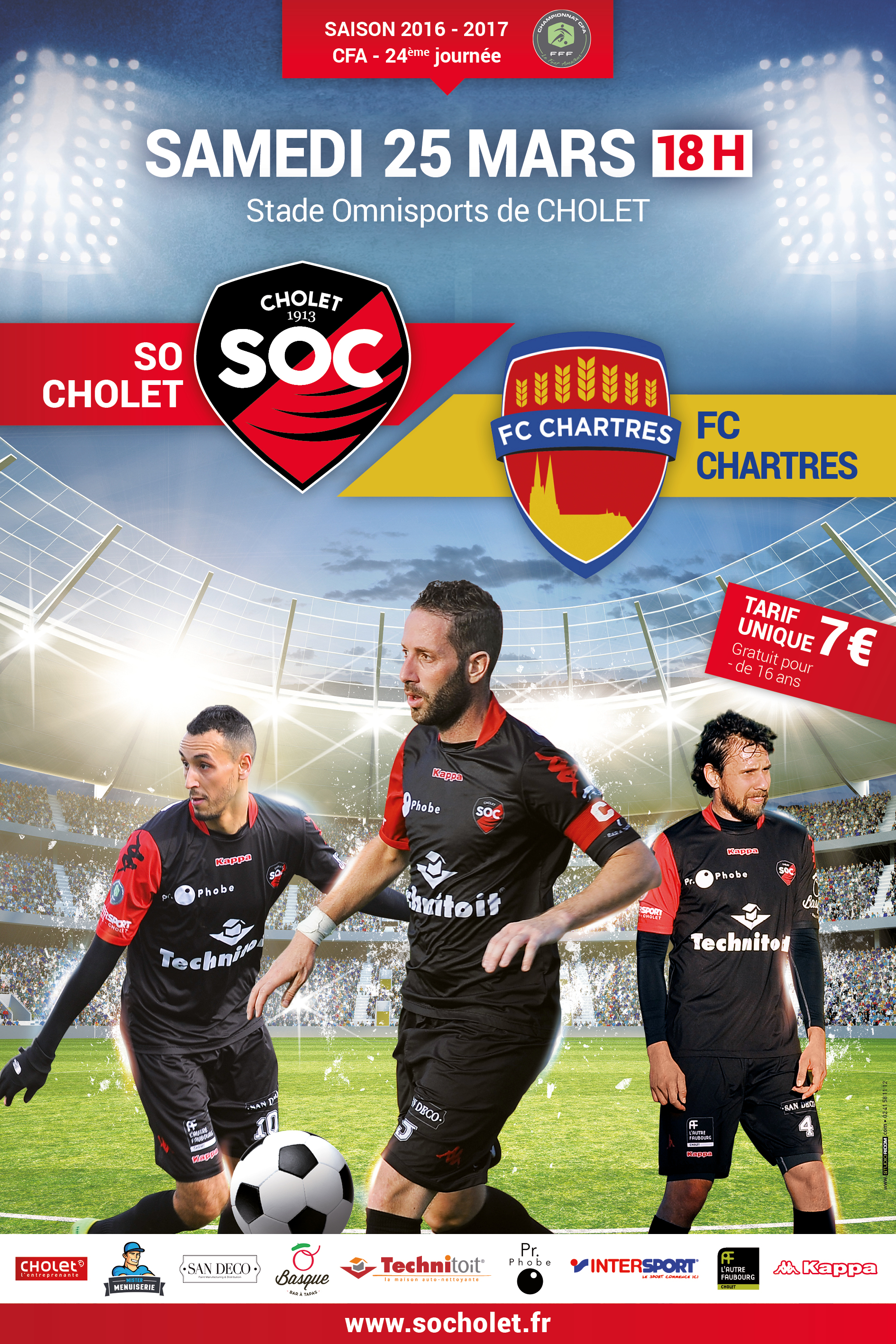 Dans le cadre de la 24e journée de CFA, le SO Cholet reçoit l’équipe du Chartres FC. Les Choletais voudront enchaîner une deuxième victoire de suite, après leur succès, le week-end dernier, à Saint-Malo (2-0). Le plus étonnant, c’est que cela n’est plus arrivé aux locaux depuis le 10 Décembre 2016, contre Mantes, puis contre Fontenay. S’ils veulent accéder, en fin de saison, au championnat National, ils n’ont plus le droit à l’erreur, surtout à domicile. Avec le crédit du match en retard à jouer contre la réserve du FC Nantes (samedi 1er Avril à 18h), les joueurs de Nicolas Le Bellec ont toutes les cartes en main, dans cette dernière ligne droite. En face, les Chartrains restent sur trois matchs nuls, mais surtout sur sept matchs sans défaite. Invaincus depuis le 21 Janvier, ils ne se déplaceront pas en victimes à Cholet. Le SOC est prévenu. A eux d’être sérieux et concentrer pour sortir vainqueur de cette confrontation.