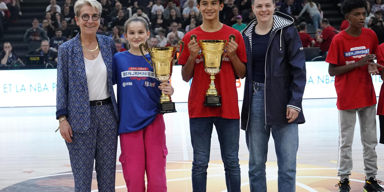 Klair LEFEUVRE (Le Mans Saint Pavin / Ligue Pays-de-la-Loire) et Tao MONPLAISIR (Association Eclair Basketball / Ligue Martinique) ont remporté hier à Paris les finales de la 17e édition du Challenge Benjamin(e)s, organisé par la FFBB en partenariat avec le programme Junior NBA. Les deux vainqueurs s’envoleront pour les Etats-Unis pour assister à un match NBA. Ils ont reçu leurs trophées des mains de Marie-Eve Paget, internationale 3×3 et Agnès Fauchard, présidente de la Commission Jeunesse de la FFBB, aujourd’hui, sur le parquet de l’Accor Arena, à l’occasion des Finales de la Coupe de France.