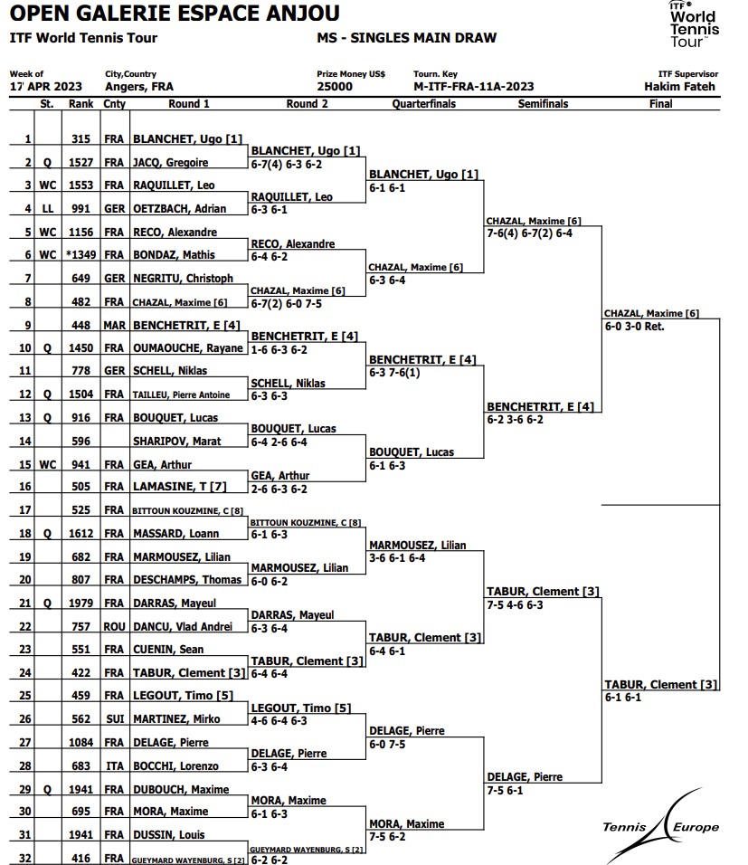 C’est avec un peu de retard que Clément TABUR (427e mondial), tête de série numéro trois, s’est présenté sur le court de central de l’Angers Tennis Club. Face à lui, on retrouve le français Pierre DELAGE (1038e mondial), très grand par la taille et l’envergure. Le premier jeu de la partie est pour ce dernier. Par la suite, il se met à commettre de nombreuses fautes directes, Clément TABUR lui envoyant des balles basses. TABUR profite de ses fautes pour faire la différence et remporter le premier set de la rencontre (6-1). Dans le second set, Pierre DELAGE rectifie le tir et commet moins d’erreurs. Mais TABUR continue sur sa lancée et déroule tranquillement son jeu. Pour le dernier jeu du match, l’angevin se retrouve au service et conclut la rencontre sur un joli revers (6-1).