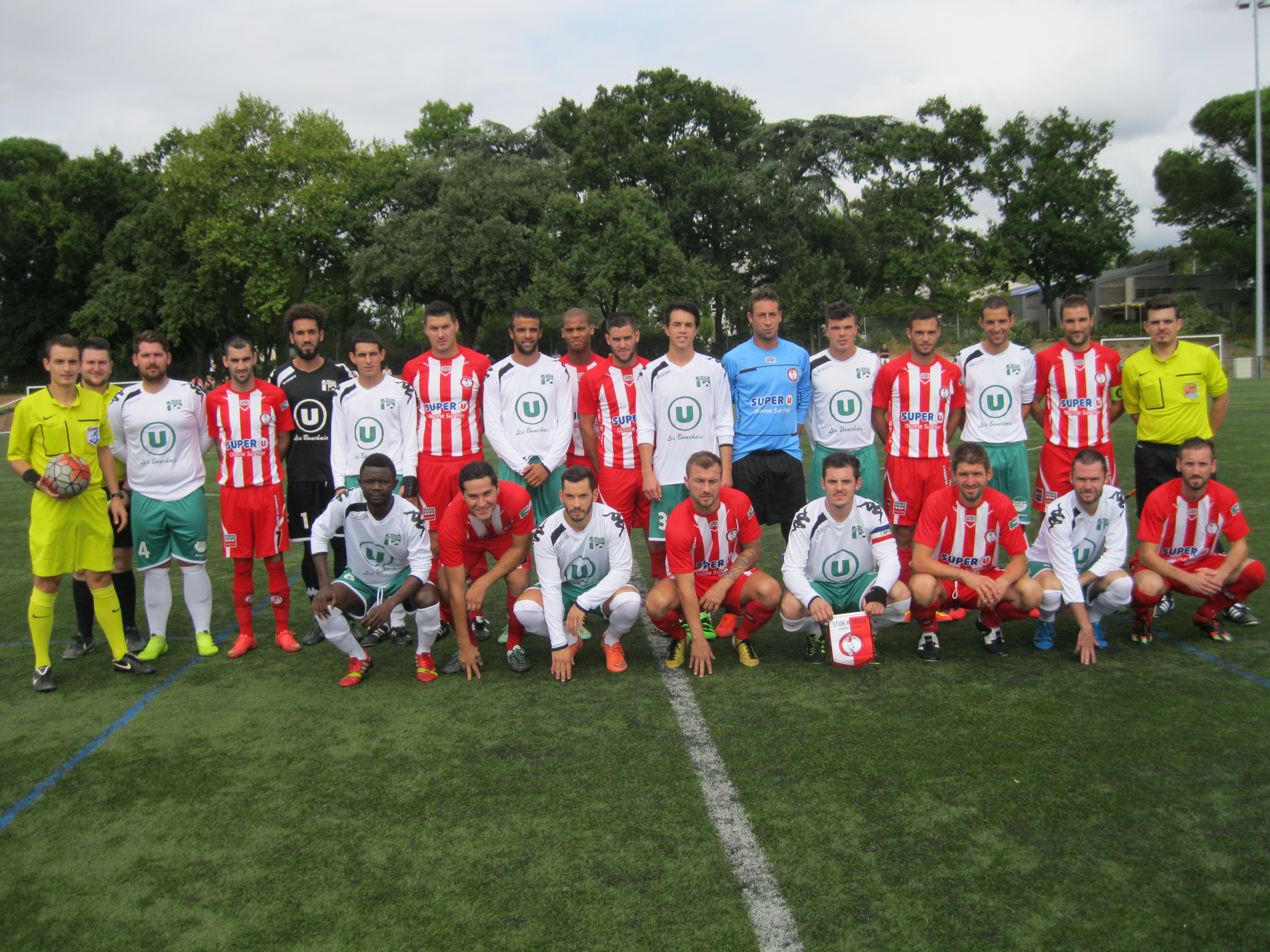 - Photo de groupe des deux équipes : Angers La Croix Blanche (en blanc) et le Stade Olonnais (en rouge et blanc)