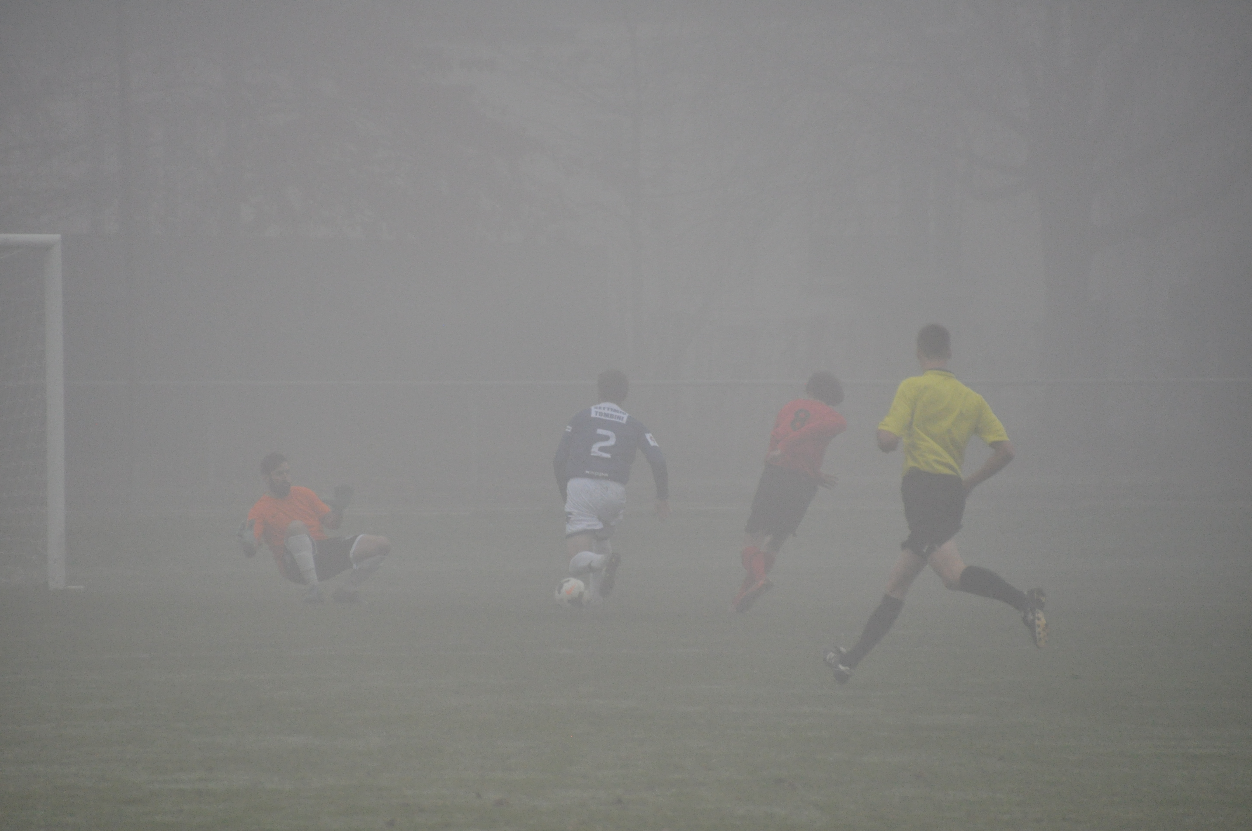 Il y avait du monde au stade Bertin. Si si, sur les bords du terrain, on parvenait à distinguer une petite centaine de courageuses silhouettes ayant bravé la brume et le froid pour assister au derby Angevin. « assister » est un bien grand mot, « entrapercevoir » ou « deviner » seraient presque des termes plus appropriés tellement il était difficile de voir les limites du terrain. La faute à une brume compacte qui s’était invitée depuis la veille sur le stade, sûrement désireuse d’obtenir une bonne place de spectatrice pour la rencontre de ce dimanche. Le moins que l’on puisse dire, c’est qu’elle a eu sa place et qu’elle ne l’a pas lâchée. Aucune éclaircie, pas un rayon de lumière de tout le match. Les joueurs n’ont pas pour autant semblé bridé pour cet inconvénient météorologique, du moins pendant un moment.
