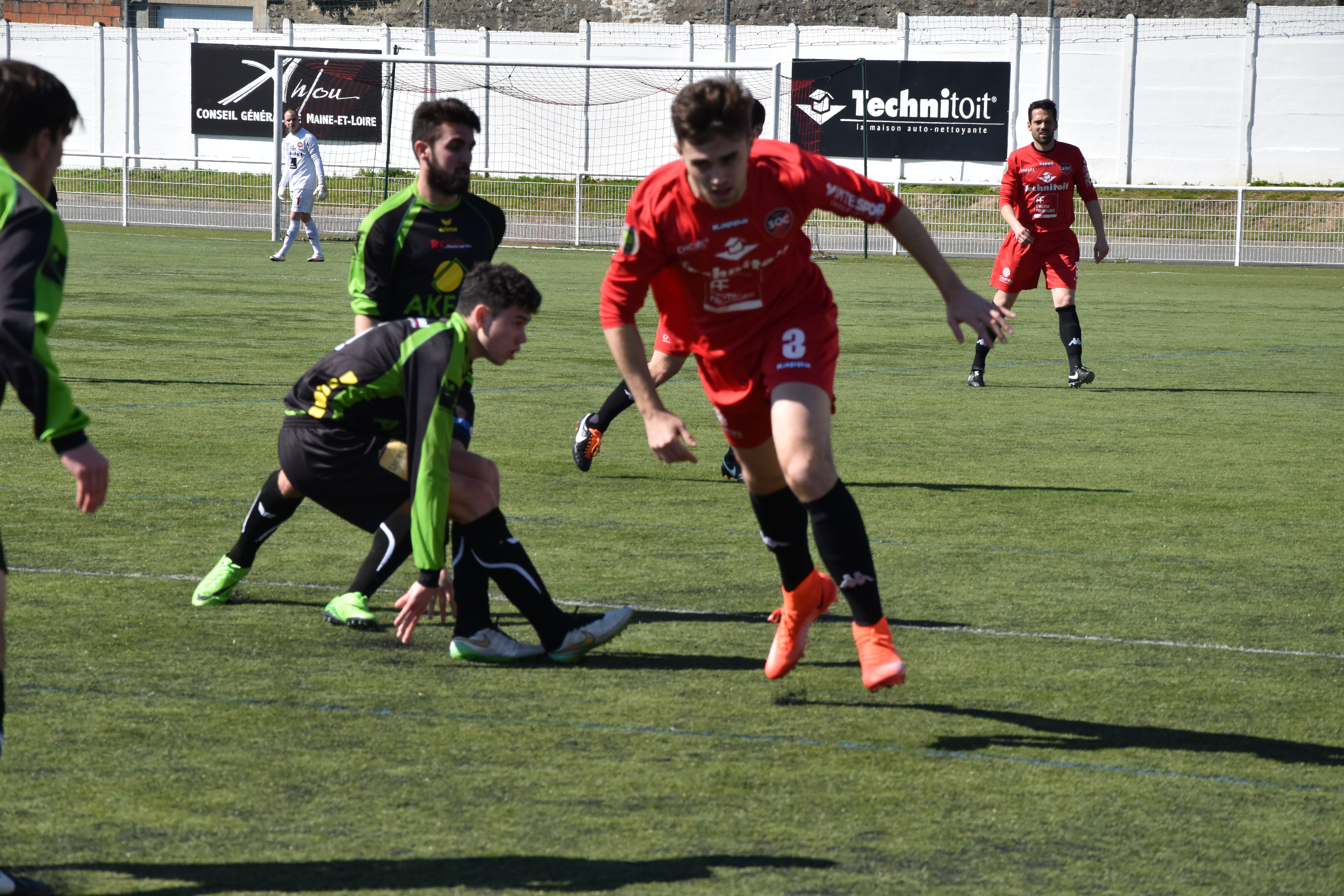 Conquérants, les footballeurs du SOC privaient totalement leurs adversaires de ballons, et suite à une belle action personnelle, Maxime Morillon était tout proche de corser l’addition juste avant la demi-heure de jeu. Dans la continuité de leur belle prestation lors des premières 45 minutes, les partenaires de Nassim Nanouche, continuaient leur domination au début de la seconde période, malheureusement pour eux, ni Youlou aux (50’, 53’, 58’), ni Morillon (52’) sur un tir qui rasait le montant du portier vendéen, ne réussissaient pas à enfoncer le clou. A force de courage, les joueurs d’Eric Vincent réussissaient à réduire le score à l’entrée du dernier quart d’heure par l’intermédiaire de Teddy Negrit. Le doute s’installait chez les footballeurs locaux, et les vendéens de la Roche, se disaient qu’ils avaient peut-être, un bon coup à jouer. Les Choletais continuaient certes à attaquer, mais ils étaient toujours aussi peu inspirés dans la finition en cette fin de partie. Les jeunes pousses de la Roche VF, avaient encore une belle occasion d’égaliser à la 83′, mais la défense Choletaise et son gardien Jonathan Monteiro faisait le travail. En toute fin de rencontre, Axel Dabin auteur d’un beau débordement sur l’aile gauche, se la jouait perso, alors que son partenaire Youlou était idéalement placé dans la surface, son tir ne trouvant que le petit filet, alors qu’il y avait quand même beaucoup mieux à faire.
