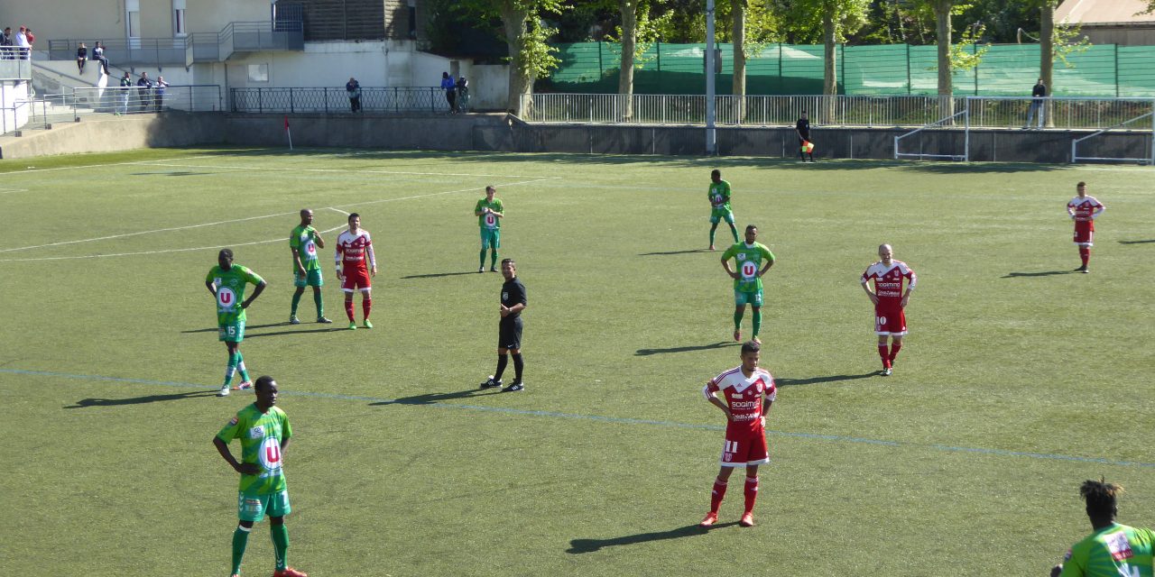 Sur sa première occasion, Vertou ouvre le score. Le centre de Martineau trouve David qui marque de la tête, seul au deuxième poteau, Guillard n’est pas exempt de tous reproches sur le coup (0-1, 9e). Martineau sert idéalement Battoy qui voit son tir à bout portant être repoussé par Guittard (14e). Il faut attendre la demi-heure de jeu, pour que les locaux se réveillent enfin. Ougrirane remise pour Mendy, qui voit son tir au ras du poteau être détourné par Bachelier (36e). Sur une remise en retrait, Zahrawi, à l’entrée de la surface, tire au-dessus (41e). A la suite d’une perte de balle au milieu du terrain, Theveny récupère le ballon, déborde côté gauche, et centre au point de penalty pour Bossin, qui n’a plus qu’à marquer d’un plat du pied (1-1, 45e+1).