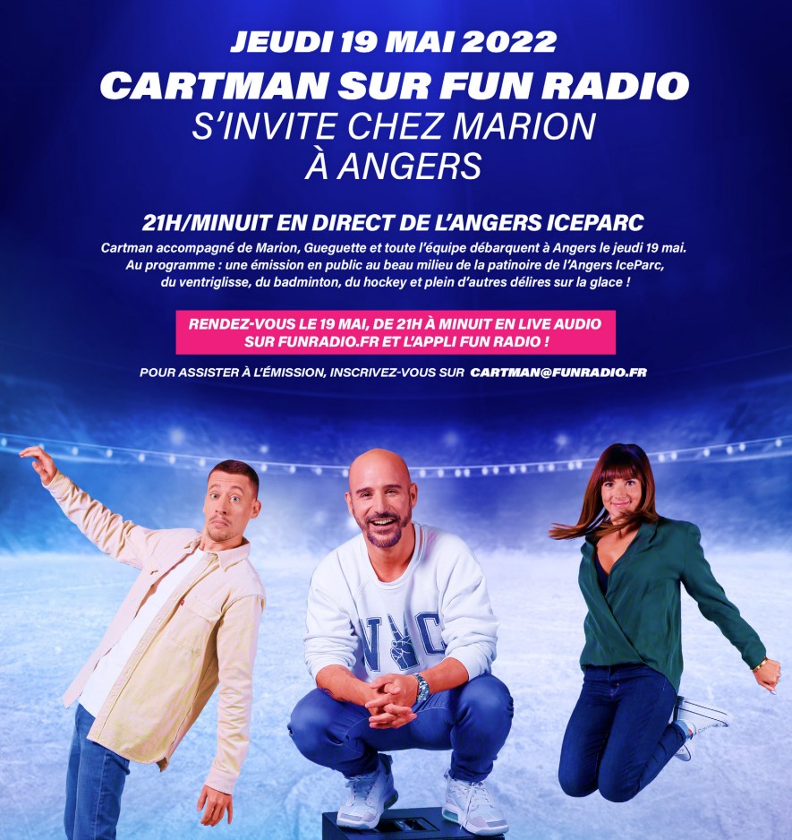 Rendez-vous ce jeudi 19 novembre, à partir de 21h00 à la patinoire ICEPARC d’Angers, où Cartman, Marion, Guéguette et toute leur équipe vous attendent pour une émission pleine de divertissements de vingt-et-une heures à minuit. Trois heures d’animation seront au programme avec notamment du ventriglisse, du badminton, du hockey et le tout sur la glace. L’équipe des Ducs d’Angers sera présente et bien-sûr, de nombreux invités surprises, avec notamment un chanteur qui devrait se produire en live. L’émission vient à la rencontre des auditeurs et se déroule donc à Angers, chez Marion. Du public est attendu pour une émission qui s’annonce divertissante !
