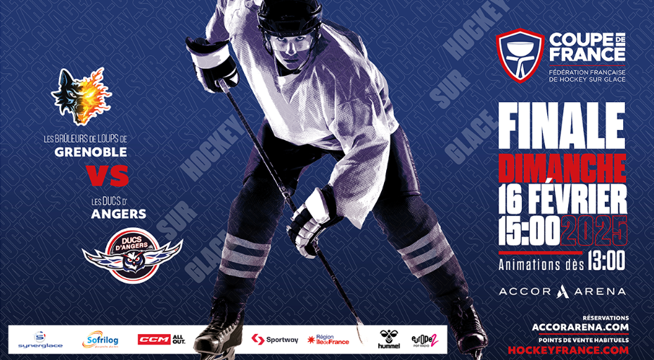 La finale de la Coupe de France de hockey sur glace se tiendra le dimanche 16 février 2025 à 15h à l’Accor Arena de Paris. Cette édition opposera les Brûleurs de loups de Grenoble, doubles tenants du titre, aux Ducs d’Angers, vainqueurs en 2022.