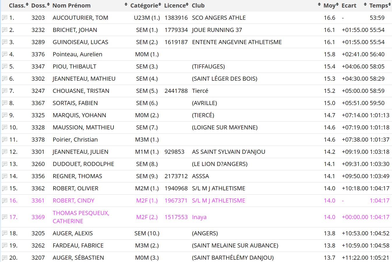 Classement du 15 km