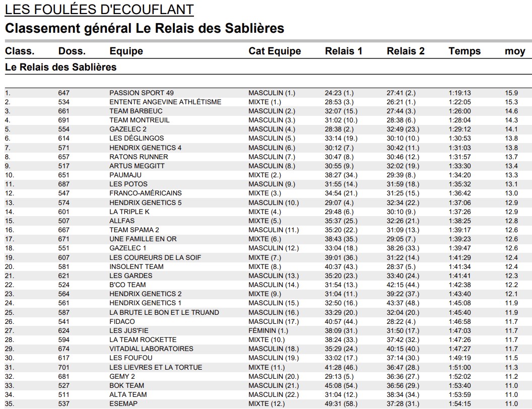 Ce vendredi soir et sous la chaleur de la fin de journée, avait lieu la traditionnelle course nature des Foulées d’Ecouflant, avec à la fois une distance sur un parcours de quinze kilomètres pour les uns, et un relais de trois coureurs, avec sept kilomètres chacun à réaliser, le long du chemin de halage, du parc des Sablières et du bourg d’Ecouflant, pour les autres. Tom AUCOUTURIER du SCO Athlé a remporté la distance des quinze kilomètres en individuel, tandis que la Team PassionSports49 a remporté l’épreuve du relais.