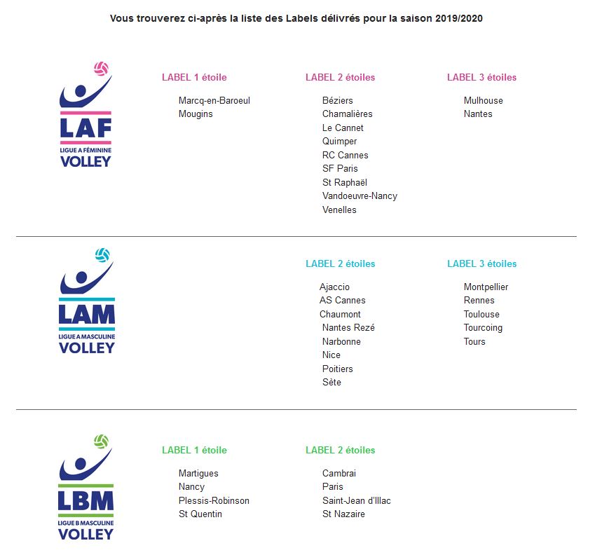 Pour cette nouvelle session du Label, trente-quatre clubs des trois divisions de la Ligue Nationale de Volley (LNV) ont reçu un Label de : une, deux ou trois étoiles.
