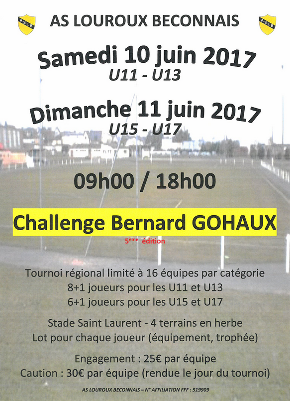 Le club de l’AS Louroux-Béconnais recherche des équipes U15 et U17 pour son tournoi du dimanche 11 juin 2017 (6+1 joueurs).