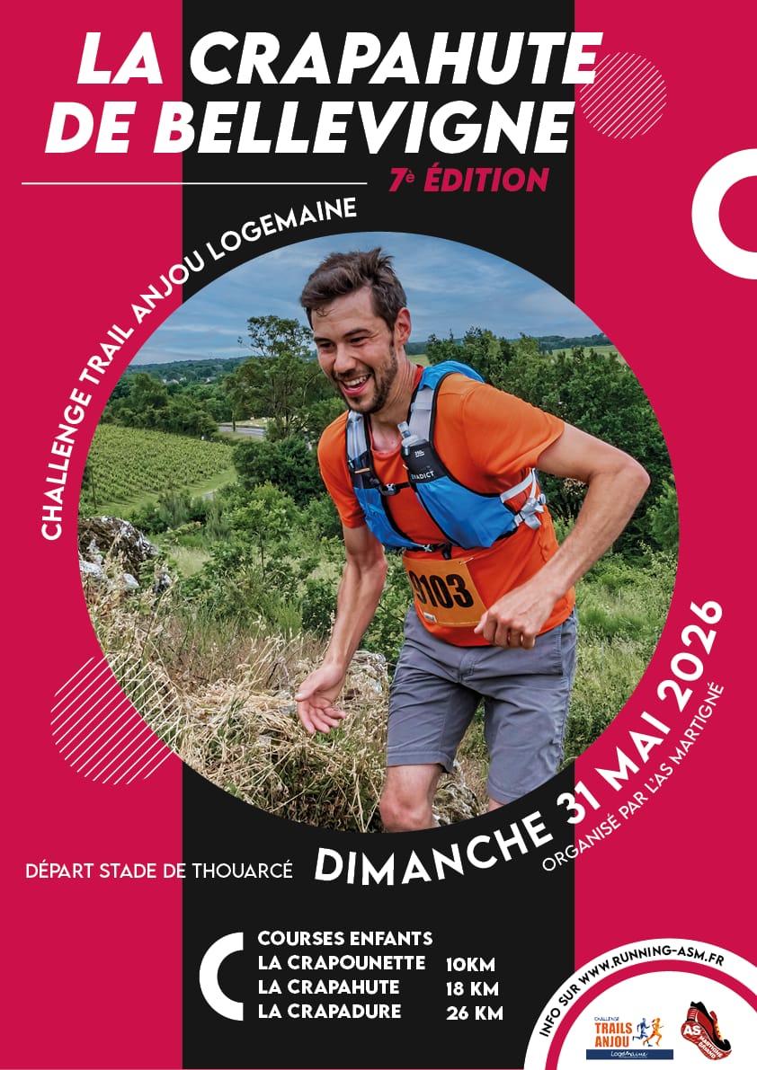 La Crapahute de Bellevigne proposera six courses pour son édition 2026, dont trois pour les enfants. Trois épreuves adultes seront au programme avec la Crapounette (10 kilomètres, 200m D+), la Crapahute (18 kilomètres, 450m D+) et la Crapadure (26 kilomètres, 700m D+). Le 10 km sera le support du Challenge Court Trail Anjou Logémaine, tandis que le 26 km sera le support du Challenge Long Trail Anjou Logémaine. Par ailleurs, l’organisation n’a pas oublié les enfants, puisque ces derniers pourront participer à la Crapa’kids 1 (700 mètres), la Crapa’kids 2 (1200 mètres) et la Crapa’kids 3 (1700 mètres). Le départ et l’arrivée de chacune des courses s’effectueront au stade des Rondières à Thouarcé. Plus d’informations via le site internet de l’organisation