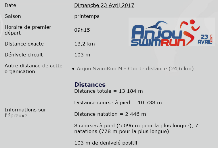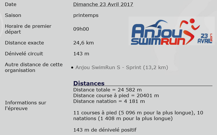 L’association AQUASPORT organise la première édition du « Anjou Swimrun », à Angers, le 23 avril 2017. Deux distances sont au programme avec un S (13 km) et un M (25 km). Le parcours à pied sera principalement en nature, avec quelques belles bosses et la natation se fera dans le lac de Maine et dans la Maine. La température de l’eau sera assez fraîche, mais la diversité du terrain devrait faire passer un excellent moment à tous les participants.