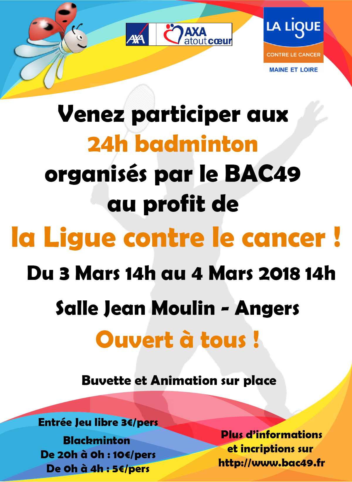Les bénévoles du BAC et ceux d’AXA ont décidé de mettre en œuvre cette action solidaire dans le but de récupérer des fonds au profit de la recherche et de la lutte contre le cancer. Ces derniers seront ensuite reversés intégralement à la Ligue du Maine-et-Loire. Cet événement est ouvert à tous, initiés comme débutants, adultes ou enfants. Les participants pourront venir jouer en jeu libre la journée et s’initier au Blackminton à partir de 20h00. Une restauration sur place, des animations, des stands d’information et de sensibilisation, et une ambiance musicale, sont prévus durant tout le week-end.