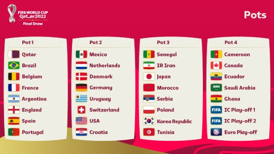 • Pot 1 : Qatar (pays-hôte), Brésil, Belgique, France, Argentine, Angleterre, Espagne, Portugal