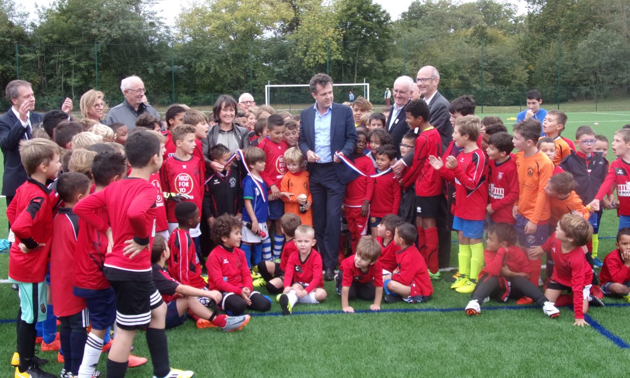 Cette inauguration a eu lieu pendant l’entraînement des U7,U9 et U11 soit avec 80 jeunes de 6 à 11 ans sur le stade et autour du maire lors de la coupure du ruban.