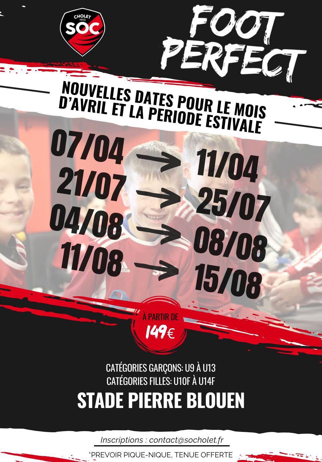Cette année, plusieurs stages sont au programme. Les différents stages se dérouleront au stade Pierre-Blouen à Cholet. Une tenue complète sera offerte par le club (maillot, short, chaussettes), ainsi qu’un goûter. Les stagiaires devront prévoir leur pique-nique. Différentes activités seront proposées (patinoire, Autre Usine…).