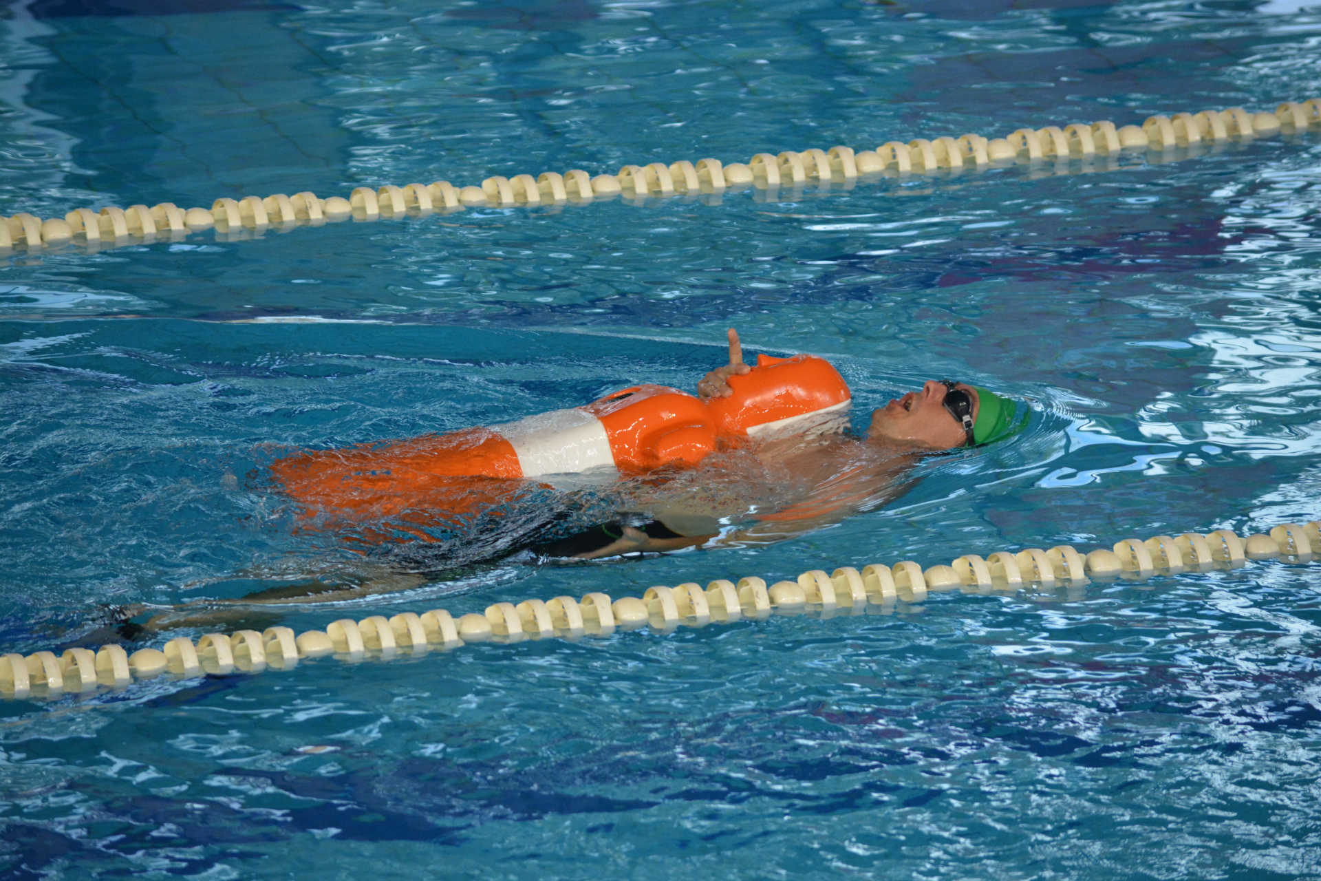 Cent mètres bouée tube : chaussé de palmes, nager cinquante mètres en traînant une bouée tube, la clipper autour d’un mannequin en surface et tracter le mannequin sur cinquante mètres.