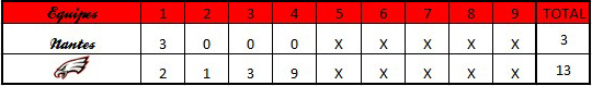 Malgré un début de match très matinal, les lanceurs de chaque équipe réussissent à museler les attaques jusqu’en début de troisième manche, où les frappeurs et frappeuses des Eagles marquent le premier point du match. Dès la manche suivante, les Mariners parviendront, non seulement, à revenir au score mais également à prendre la tête au tableau d’affichage. L’attaque des Eagles ne lâchera rien durant le reste du match, entamant même la septième manche avec trois points d’avance. Les Nantais reviendront à six partout, avant de sceller le match sur un walkoff hit (frappe permettant à l’équipe menée de prendre l’avantage dans la dernière demie manche et par cette occasion d’emporter la victoire) de l’une de leur frappeuse, et donnant la victoire aux Mariners, sept à six.