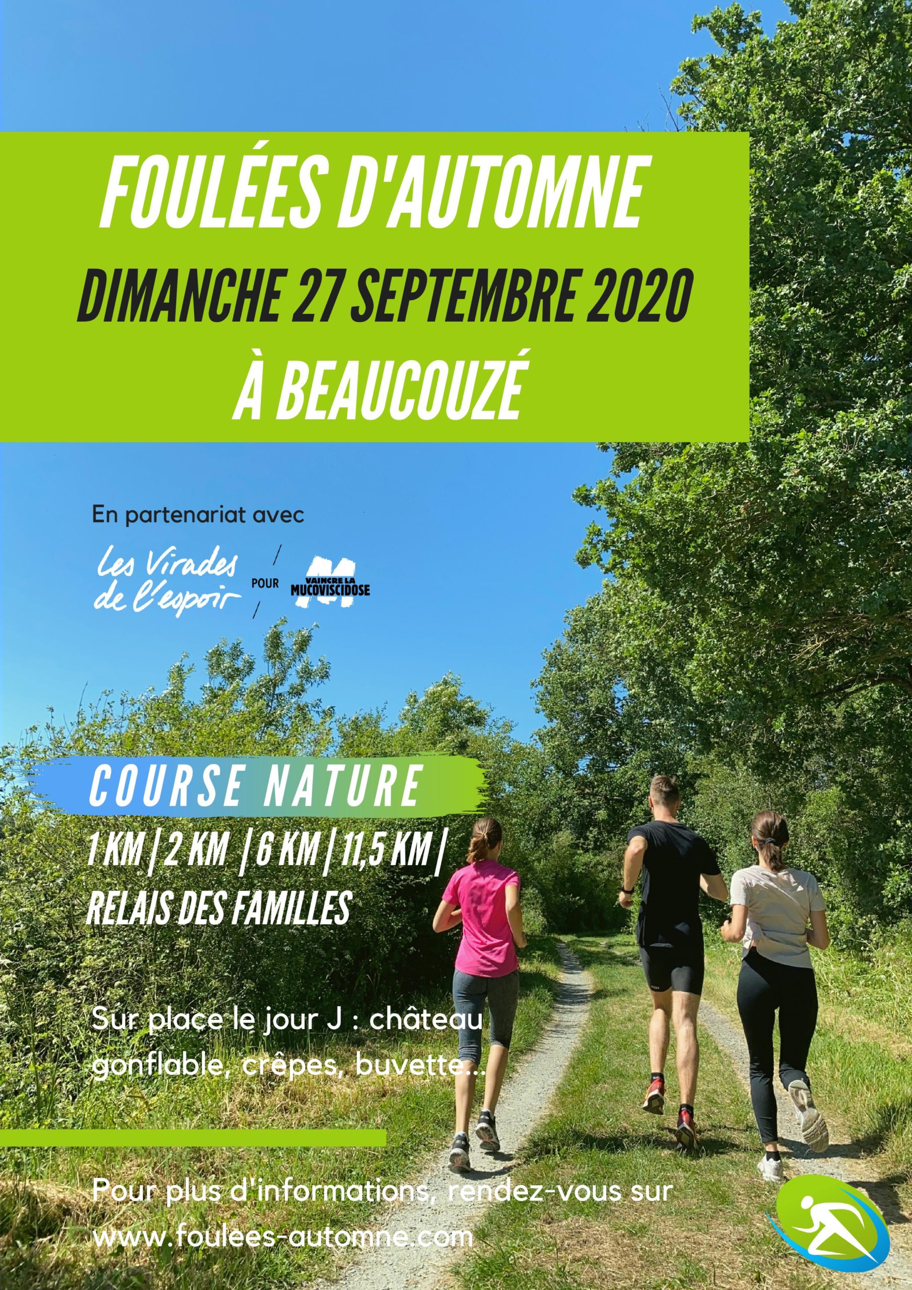 L’association sportive « les foulées d’Automne » vous convie à sa trente-huitième édition des foulées qui se déroulera, le dimanche 27 septembre 2020, en début d’après-midi à Beaucouzé (à partir de 14h50). Cet évènement 2020 se constituera de deux courses nature de 6.5 et 11.5km ouvertes à tous les coureurs de plus de seize ans. Les courses emprunteront des propriétés privées exceptionnellement accessibles pour l’occasion (bois, sentiers, château…).
