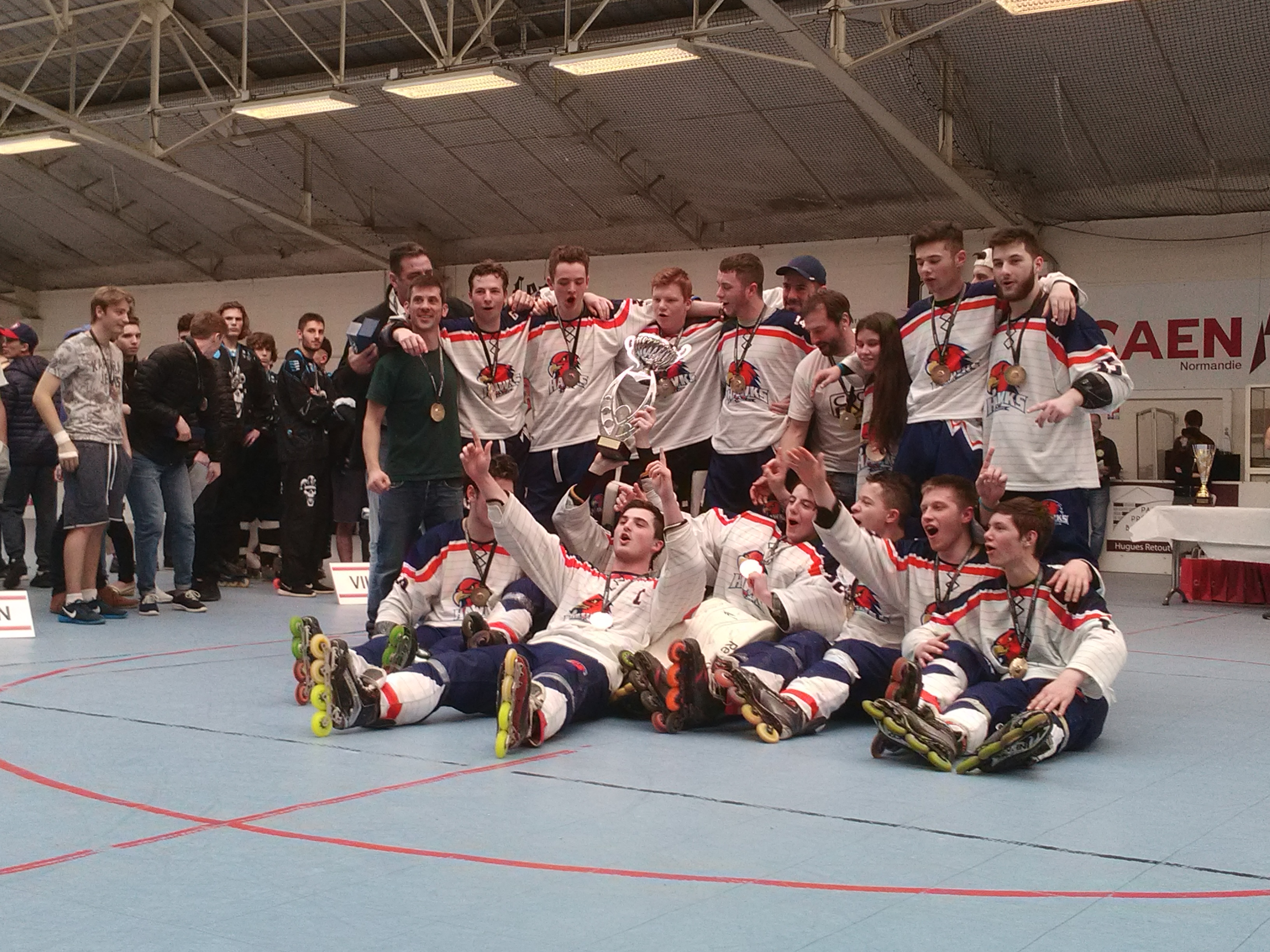 - L’équipe des Hawks Angers Rollers avec la coupe de Champion de France Juniors Élite.