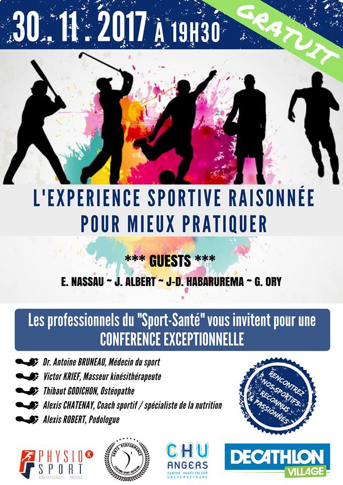 « Je suis actuellement chargé de développer un projet autour du Sport et de la santé. Pour ce faire, j’ai choisi de mettre en place une Conférence Sport/Santé qui aura lieu le 30 novembre à partir 19h30 au Décathlon village Les Ponts-de-Cé. Cette conférence est accessible à tous, quel que soit le niveau de pratique ou la disponibilité consacrée à son sport. Je souhaite par ce projet donner l’opportunité au grand public de rencontrer des spécialistes de la santé et du sport, ainsi que des sportifs confirmés. L’objectif de cette conférence est d’apporter un raisonnement d’approche pour une pratique sportive occasionnelle ou régulière. L’entrée est gratuite. »