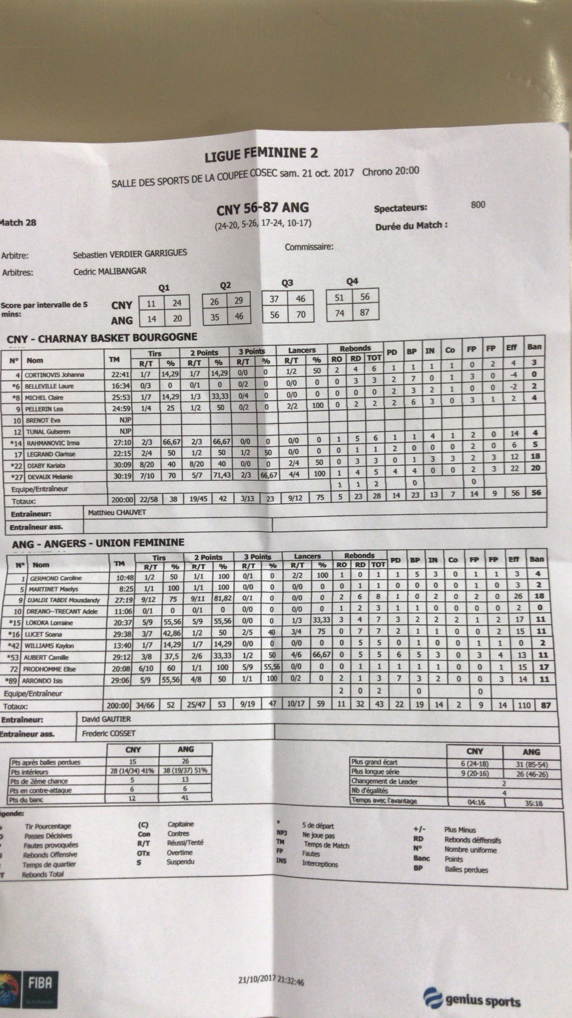 Union Féminine Angers Basket : Germond (4), Martinet (2), Djaldi-Talbi (18), Dreano-Trecant (0), Lokoka (11), Lucet (11), Williams (2), Aubert (11), Prodhomme (17), Arrondo (11).