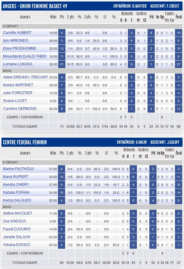 Union Féminine Angers Basket 49 Centre Fédéral FFBB : 71-44 (MT : 35-19)