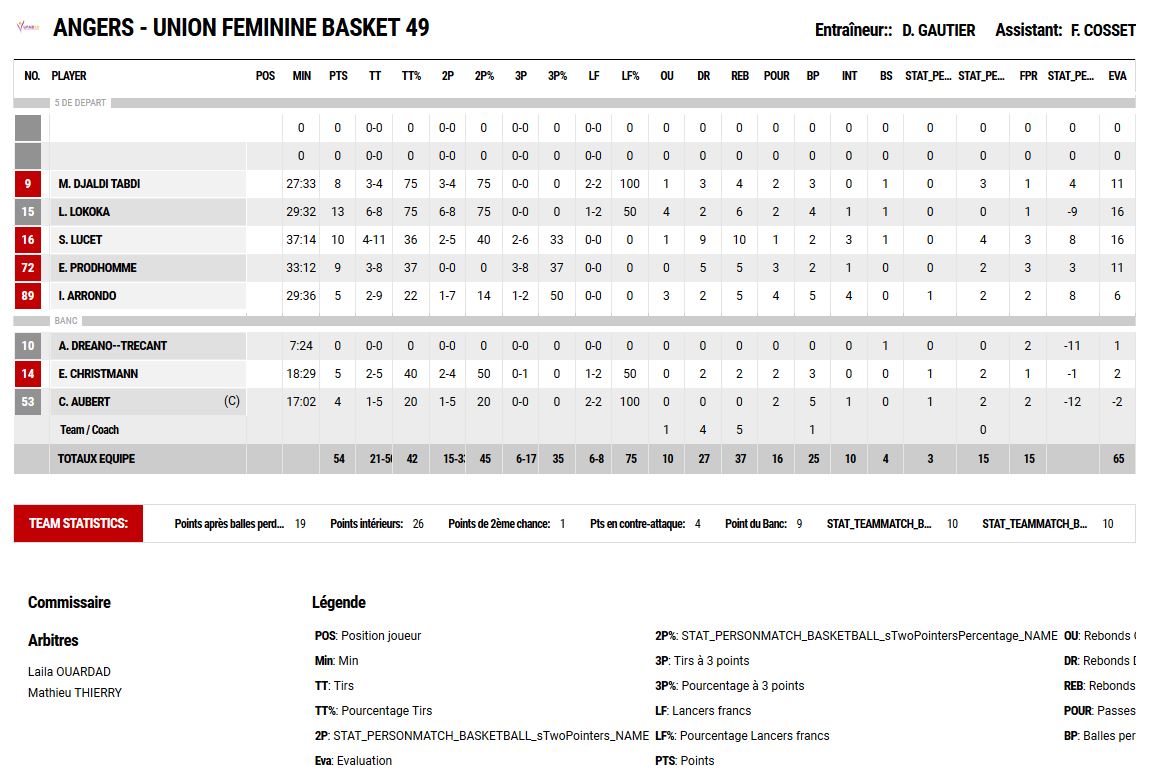 Union Féminine Angers Basket : Djaldi-Tabdi (8), Lokoka (13), Lucet (10), Prodhomme (9), Arrondo (5), Germond (NJP), Martinet (NJP), Dreano-Trécant (0), Christmann (5), Aubert (cap.) (4). Entraîneur : David GAUTIER.