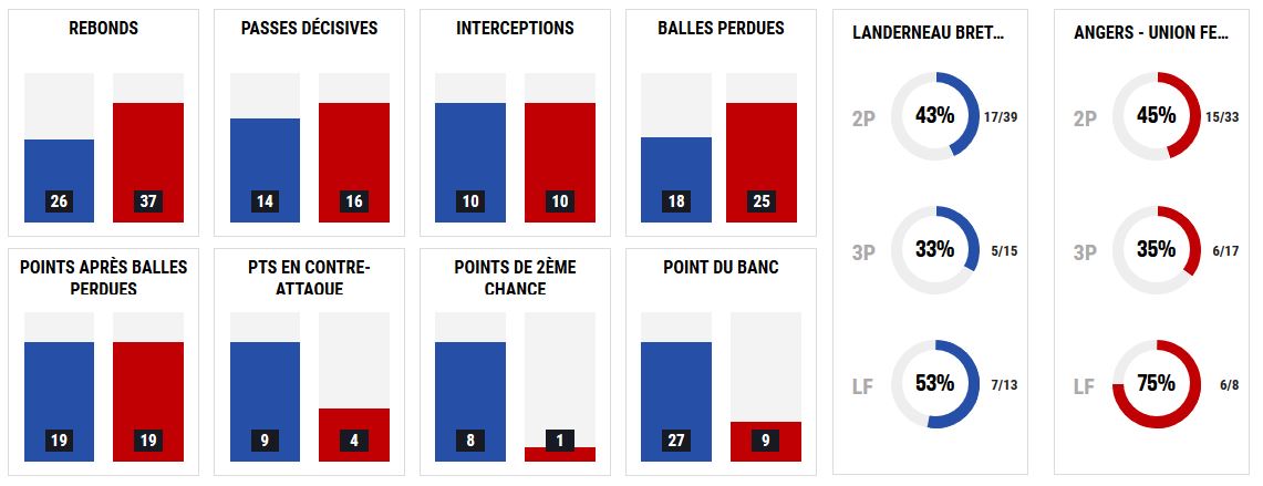 La réaction d’après-match de David GAUTIER (entraîneur de l’Union Féminine Angers Basket) : « On est vingt-cinq minutes devant et à cinq minutes de la fin, le score est de 51 à 54. On est devant avec quatre possessions dans les mains pour prendre quatre, cinq ou six points d’avance. Malheureusement, on ne met pas un panier dans ce final en ayant des positions favorables. Du coup, sur ce match, je me demande si on le mérite. Les filles ont été dans l’engagement et ont répondu au défi physique, mais il a manqué un petit truc… »