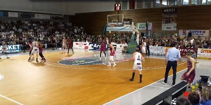 L’Angevine Lucet ouvre le score (0-2, 1’10), mais Logan égalise sur deux lancers francs (2-2, 2’36). Prodhomme et Lucet à trois points, puis Lokoka sur un jumpshot concluent un 8-0 (2-10, 4’11). Naigre stoppe l’élan adverse (4-10, 4’53). Lucet accentue l’avantage à +10 points pour les « violettes » (6-16, 6’26). Stervinou à trois points, puis Logan dans la raquette recolle leur équipe dans le match (13-18, 8’32). Djaldi-Tabdi, à la suite de deux lancers francs conclut le premier quart-temps, avec six points d’avance pour l’UFAB (17-23, 10′). Butard, à trois points, remet à une possession d’écart son équipe (21-23, 10’55). Le Bruchec donne pour la première fois du match l’avantage aux Bretonnes (24-23, 11’19), puis elle accentue l’avantage (26-23, 12’47). Mais Angers ne se démobilise pas sous la pression et le public adverse. Lokoka relance son équipe, puis Djadi-Tabdi égalise (26-26, 13’54). Cette dernière donne un peu d’air à son équipe (26-31, 14’52). Mais le match est serré et Le Bruchec recolle son équipe une unité (32-33, 16’32). Lors de la fin de la première période, les défenses vont prendre le pas sur les attaques adverses et le score ne bougera pas (32-33, 20′).