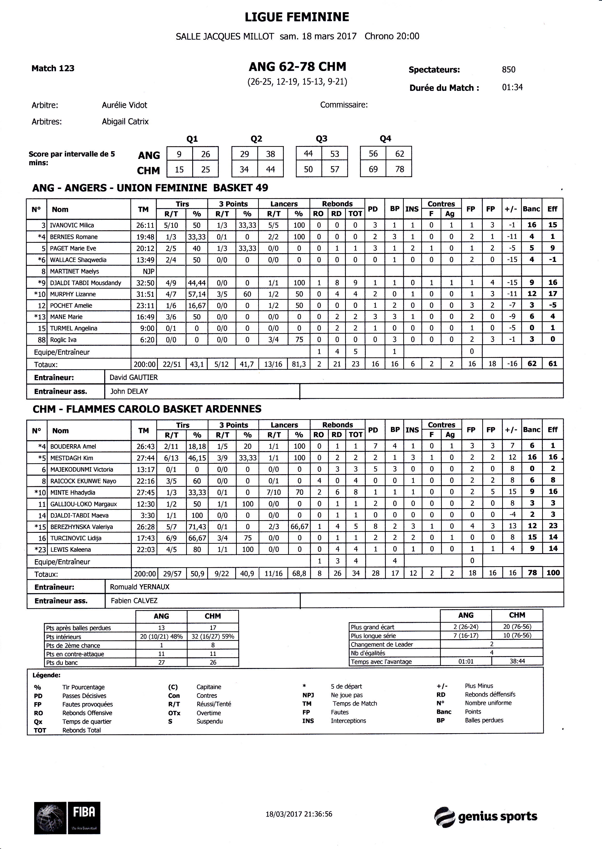 Union Féminine Angers Basket : Ivanovic (16), Bernies (4), Paget (5), Wallace (4), Djaldi-Tabdi (9), Murphy (12), Pochet (3), Mané (6), Turmel (0), Roglic (3).