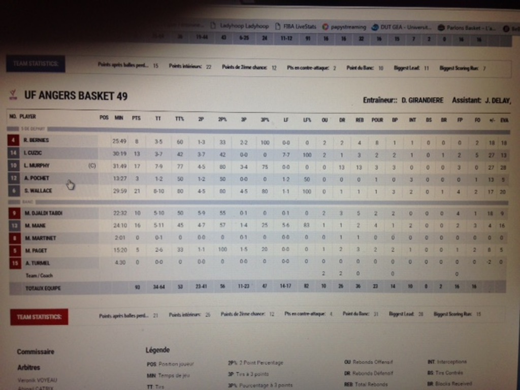 David GIRANDIERE pouvait donner du temps de jeu à Angélina TURMEL et la très jeune Maelys MARTINET. Nice n’y était plus, tandis que l’UFAB ne lâchait rien, pour terminer sur un remarquable +26 (67-93). Une superbe performance des Angevines, « à l’extérieur », qui plus est, le calendrier étant fait ainsi.