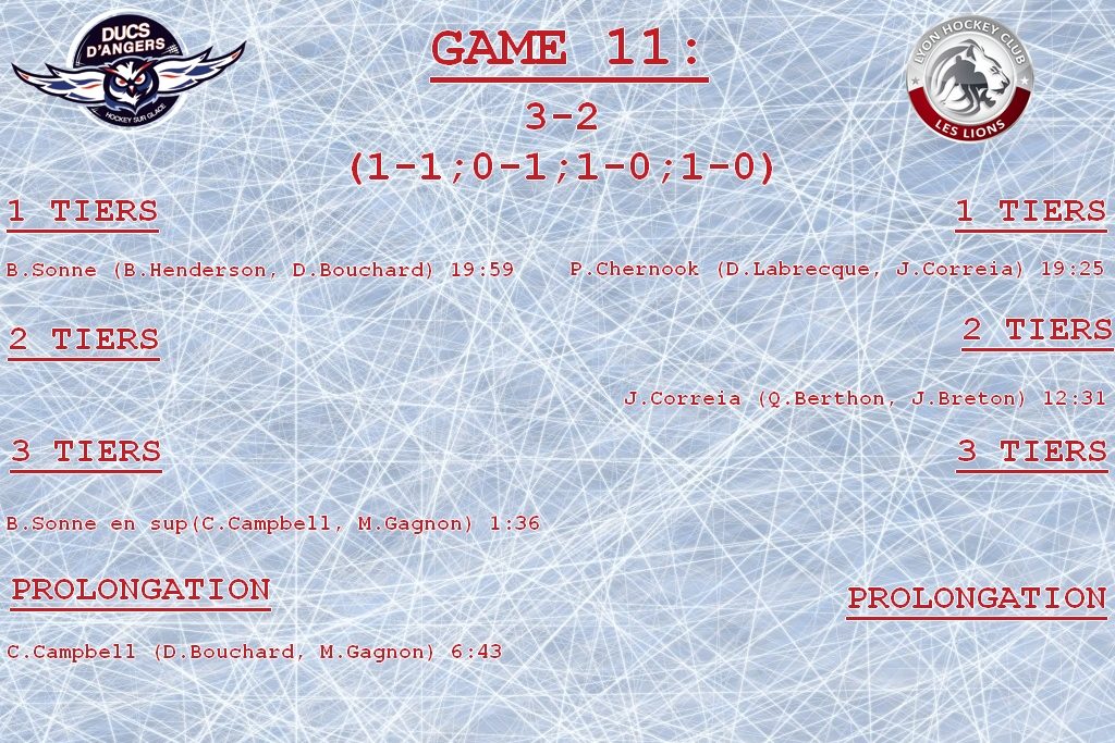 Le début de la prolongation est rythmé par les hommes de Sonne. Mais, ils se font sanctionner et Lyon n’arrive pas à trouver les opportunités, qui aurait pu tuer le match. La rencontre se durcit et Lyon est alors pénalisé. Au contraire, les Ducs en profitent et marquent le but qui scelle le score définitivement. Le but est marqué par Cody Campbell, assisté de D.Bouchard et de M.Gagnon (3-2, 6’43).