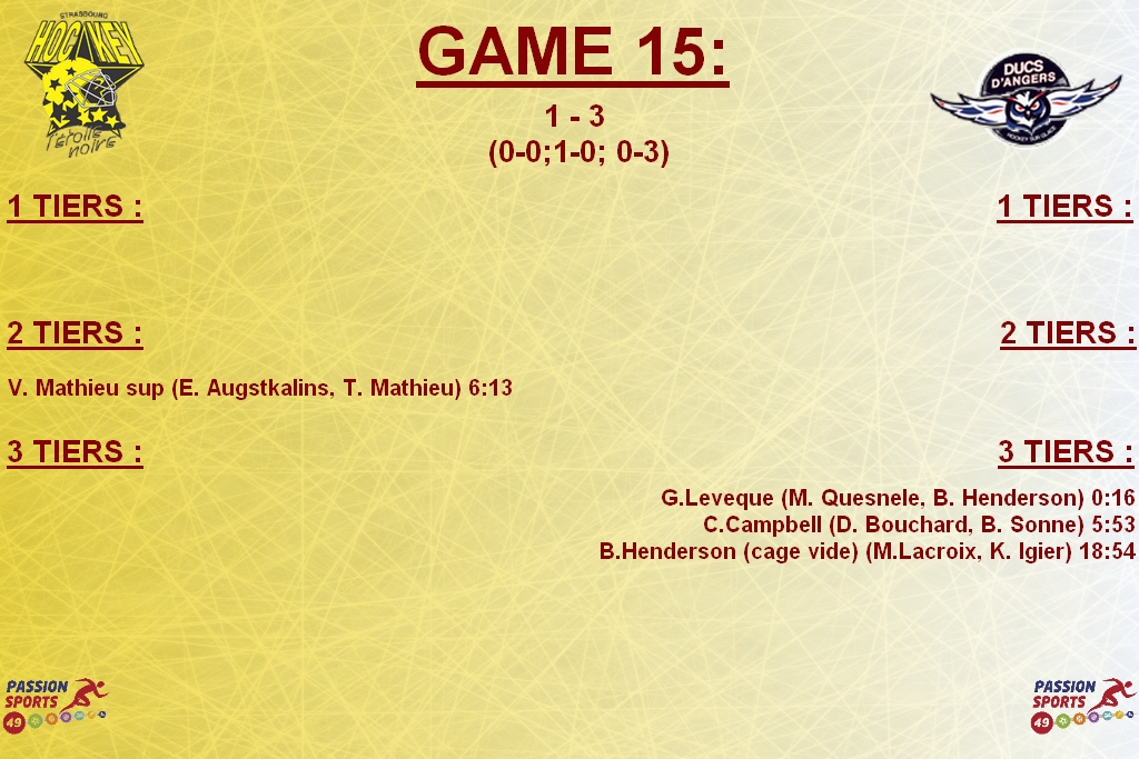 D’entrée de jeu dans le dernier tiers-temps, les Angevins commencent sur les chapeaux de roue, en égalisant rapidement. Brian Henderson passe le palet à Michael Quesnele, qui le transmet à Gary Levêque sur la gauche, ce dernier trouve les filets strasbourgeois (1-1, 0’16). Les Angevins continuent de pousser et marquent de nouveau, malgré des contre-attaques de l’Étoile Noire. Le but est marqué par Cody Campbell, sur un tir dévié de Danick Bouchard et d’une passe de Brett Sonne (1-2, 5-53). Le coach de Strasbourg demande un temps-mort (trente secondes où le staff donne des consignes aux joueurs). Il prend alors le risque sortir son gardien de but, mais malheureusement, à la suite d’une perte de palet dans le camp angevin, les Ducs en profitent pour clôturer le score avec un dernier but dans la cage vide, de Brian Henderson, assisté de M. Lacroix et K. Igier (1-3, 18’54). Les hommes de Daniel Bourdages n’ont pas démérité, mais ils n’ont pas su tuer le match plus tôt.