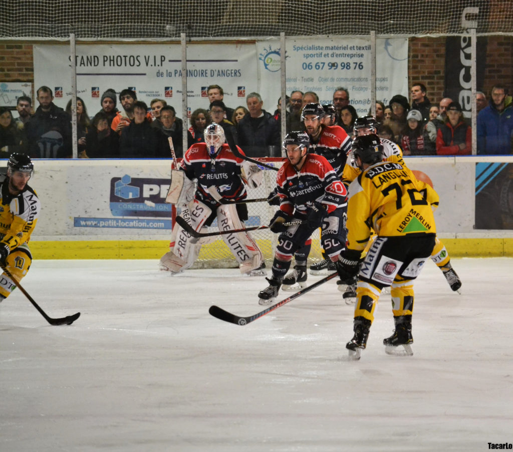 A la suite d’une belle action collective rouennaise, Nicolas Deschamps ouvre le score, assisté d’Anthony Guttig et de Mathieu Brodeur (0-1, 7’59). Ce qui sera le seul but de la première période, malgré plusieurs situations dangereuses dans les deux camps. Puis dès le début de la seconde période, Justin Hamonic, dans sa zone défensive, lance un palet en profondeur pour Maxime Lacroix, qui s’arrache entre deux défenseurs pour égaliser (1-1, 20’57). Sur une passe de la ligne bleue, Anthony Guttig dévie la trajectoire du palet, et le glisse entre les patins de Charpentier (1-2, 32’38). A la suite d’une remise en jeu dans le camp rouennais, Angers va à nouveau égaliser par l’intermédiaire de Robin Gaborit, assisté de Cody Campbell et de Justin Hamonic (2-2, 34’27). Le troisième tiers-temps va être un combat, où le match aurait pu basculer d’un camp à l’autre, mais malheureusement sur une relance plein axe, le Rouennais Loïc Lamperier va en profiter pour subtiliser le palet dans la crosse du défenseur angevin, puis marquer dans un angle du but ouvert par le portier adverse (2-3, 51’26). Dans la dernière minute, Angers va tenter le tout pour le tout pour revenir au score, en sortant son gardien de but pour bénéficier d’une supériorité numérique. Malheureusement, les Angevins vont se faire contrer, et sur une passe de Loïc Lampérier, Marc-André Thinel marquera un quatrième but anecdotique, dans une cage vide (2-4, 59’22).