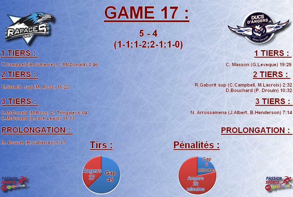 Face au quatrième du championnat, c’était l’occasion pour les Angevins, de rebondir face à l’une des équipes du top quatre. Malheureusement, les pronostics ont bien été en faveur des Gapençais. Ils ont su saisir les failles adverses pour remporter la rencontre, durant la prolongation Auteur de quarante arrêts durant la rencontre, Angers pourra remercier son gardien de but, Florian Hardy, pour quelques parades décisives, mais insuffisantes pour gagner. Les Ducs ne sont pas passés loin de la victoire. Au final et pour son neuvième match à l’extérieur, les Ducs s’inclinent pour la septième fois de la saison (5-4). Au vu de la physionomie de la rencontre, les Rapaces de Gap méritent leur victoire et restent au contact du podium, avec trois matchs de retard. Pour Angers, la situation est de plus en plus compliquée et les jokers deviennent de plus en plus rares. Dès mardi prochain à domicile, face aux Niçois (8e), il sera très important de gagner pour remonter dans le top huit, synonyme de play-offs.