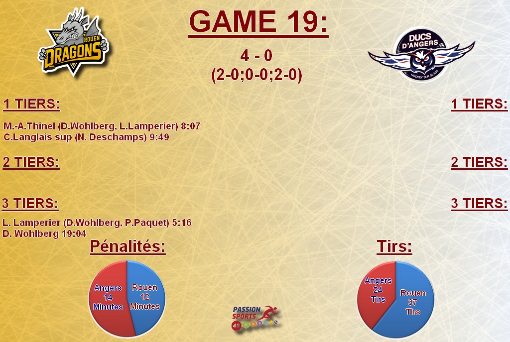 C’était l’occasion pour les Angevins, de rebondir face à l’une des équipes du top quatre du championnat. Malheureusement, les pronostics ont bien été en faveur des Rouennais. Ils ont su poser leur jeu et dominer la rencontre. Au final et pour son neuvième match à l’extérieur, les Ducs s’inclinent pour la huitième fois de la saison (4-0). Au vu de la physionomie de la rencontre, les Dragons de Rouen méritent leur victoire. Cela leur permet de garder leur deuxième place et de prendre des points d’avance sur le troisième. Pour Angers, la situation est de plus en plus compliquée et les jokers deviennent de plus en plus rares. La trêve va être la bienvenue pour permettre aux Ducs de se refaire une petite santé et de travailler sur leurs points faibles, avec on l’espère, qu’ils trouvent les solutions.