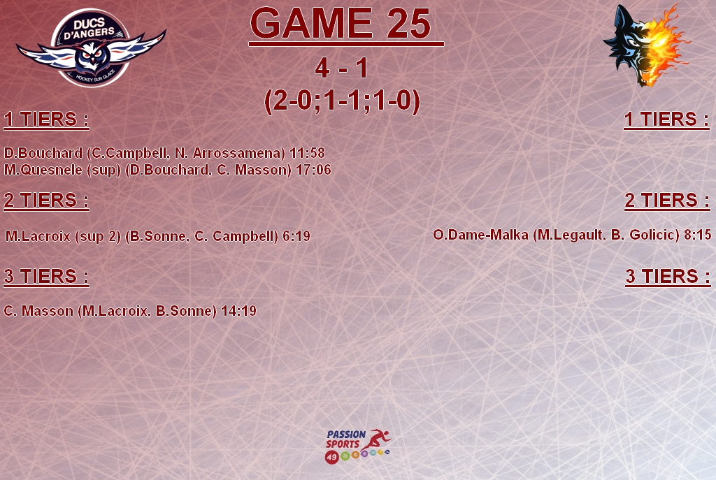 Ce vendredi, les Ducs d’Angers recevaient au Haras les Brûleurs de Loups de Grenoble pour le compte de la 25e journée de la Ligue Magnus. Après leur victoire contre à l’ile Lacroix, les Ducs se devaient de confirmer et quoi de mieux que contre le leader. Côté Angevin, on comptait deux absents, Mathieu Gagnon, Brain Henderson. Les Grenoblois, Jean-Philippe Cote et Sébastien Bisaillon (en cours de match), étaient absents pour cette rencontre. A l’image de la victoire à Rouen, les Angevins ont utilisé la même tactique. Ce match est le match de référence pour Angers, cette saison, dans le domaine défensif. On espère que les Ducs reproduiront la même prestation face au Gamyo d’Épinal, ce dimanche, à Poissonpré.