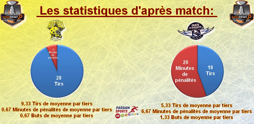 Dans ce premier tiers-temps, les deux équipes s’observent un peu. Angers prend un léger avantage, car ils ont la possession du palet, mais la défense de Strasbourg travaille bien. Après plus de la moitié du tiers-temps, les Ducs prennent le jeu à leur compte et cela se concrétise par deux buts. Le premier but est marqué par Matthieu Frecon, assisté de Maxime Lacroix et de Clément Masson (0-1, 11’32). Le second but est l’œuvre de Nicolas Arrossamena, assisté de Danick Bouchard (0-2, 17’07). En fin de tiers-temps, les nombreuses tentatives de tirs de l’Étoile Noire sont récompensées par un but de Roope Nikkila, assisté de Sergejs Pecura et de Johan Burlin (1-2, 19’55).