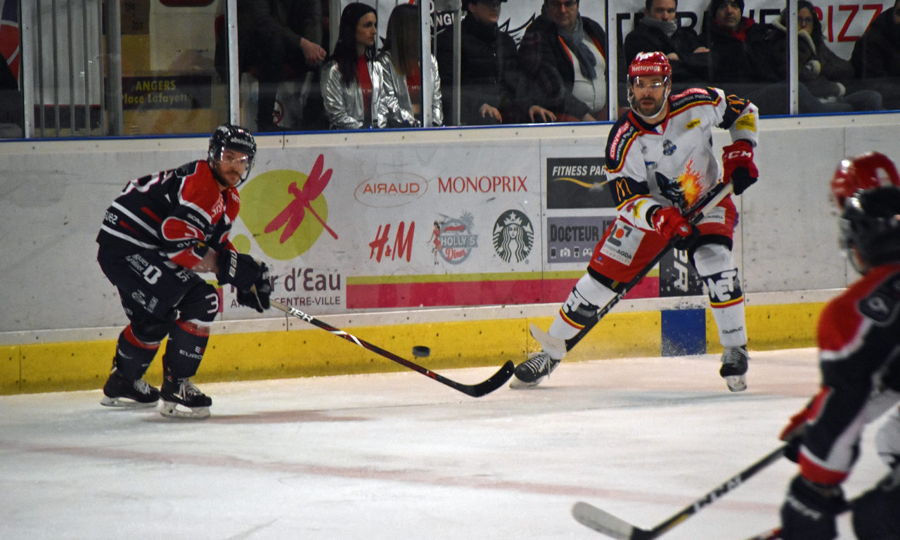 Ce match aura été fort en émotion et les éventuels retardataires n’auront eu aucune excuse de manquer le début de match. En effet, la rencontre aura débuté avec trente minutes de retard sur l’heure prévue, pour un problème de glace, le temps de régler le problème. Dans l’interrogation pendant de longues minutes, le coup d’envoi était finalement validé par les arbitres pour une rencontre qui allait s’annoncer riche en buts. Le premier tiers-temps et les premières minutes de jeu, vont être un festival de buts de part et d’autre, se renvoyant coup pour coup. Et dès la première supériorité numérique, Grenoble va ouvrir le score en supériorité numérique pour sa première occasion du match. Masqué par Joël Champagne devant sa cage, Florian Hardy, le gardien de but angevin, appréhende mal la trajectoire du long lancer de Sébastien Bisaillon (0-1, 1’01). Bien lancé par Mathieu Gagnon, Loïc Farnier prend toute la défense de vitesse sur le côté gauche et dans un angle impossible trouve le chemin des filets (1-1, 2’23). Grenoble va reprendre l’avantage sur un tir de Guillaume Leclerc, qui trouve la lucarne du but angevin (1-2, 3’31). Puis, à la suite d’une belle remise plein axe de la nouvelle recrue angevine, Chris Lawrence, Matt Carter n’a plus qu’à ajuster la mire (2-2, 4’29). Les Brûleurs de Loup vont rapidement reprendre l’avantage sur une contre-attaque tout en vitesse, emmenée par Connor Hardowa sur le côté droit, Sébastien Rohat conclut l’action d’un tir frappé face au but (2-3, 6’17). A nouveau, Angers va égaliser pour la troisième fois, en profitant d’une supériorité numérique. De son propre camp, Mathieu Gagnon remonte toute la glace, s’appuie sur Maxime Lacroix en remise, pour conclure son action initiale (3-3, 10’48). Dans la foulée, Edo Terglav, l’entraîneur grenoblois, prend alors la décision de sortir son gardien de but, Lucas Horak. Suite à une superbe action collective, qui déstabilise les Ducs, le Grenoblois Damien Fleury inscrit le quatrième but de son équipe (3-4, 11’51). C’est cette fois, du côté angevin, que l’on procède à un changement de gardien de but, Isaac Charpentier remplaçant Florian Hardy dans la cage. Moins de deux minutes plus tard, Guillaume Leclerc signe un doublé, assisté de Denny Kearney et de Patrick Mceachen (3-5, 13’06). Suite à une rapide perte de balle angevine en zone offensive, Joël Champagne récupère la rondelle et remonte la glace sur le côté gauche, puis sert dans l’élan Patrick Mceachen, pour le sixième but grenoblois et surtout neuvième but de la rencontre en quinze minutes (3-6, 15’37) ! Au retour des vestiaires, Angers va tenter de réduire le score. Malgré plusieurs tentatives, Antoine Bonvalot, le porter adverse, préserve son camp. En double supériorités numériques, sur un lourd lancer de Danick Bouchard, superbe plongeon défensif d’Antoine Bonvalot, Matt Carter récupère au deuxième poteau, remise pour Clément Masson qui sert Maxime Lacroix, qui n’a plus qu’à placer la rondelle dans l’angle ouvert (4-6, 30’53). Le tournant du match va intervenir au plus mauvais moment. En effet, le match se rééquilibre, mais sur un lancer anodin en zone neutre d’Antonin Manavian, Isaac Charpentier réalise la boulette du match en laissant filer le palet dans ses propres buts (4-7, 33’55). Dès le début de la troisième période, les espaces se libèrent à quatre contre quatre. A la suite d’une remise en jeu en zone offensive, Danick Bouchard fait le tour de la cage adverse et sert devant le but Patrick Coulombe, qui marque à son tour (5-7, 41’14). Joël Champagne sert à la limite du hors-jeu Guillaume Leclerc, qui dévie pour Aleksandar Magovac, ce dernier remporte son duel avec Isaac Charpentier (5-8, 47’46). Le match est plié et le rythme de la rencontre va baisser en intensité, tout comme l’ambiance dans les tribunes. Grenoble va inscrire deux derniers buts anecdotiques pour atteindre la barre des dix buts comme lors de leur premier match à Angers. Sébastien Rohat décale côté droit Damien Fleury, qui trouve la lucarne opposée du but (5-9, 48’29). Face à un adversaire sonné, Grenoble continue à jouer son hockey et Damien Fleury ne se privera pas pour inscrire un dixième but, sur une remise devant la cage d’Olivier Latendresse (5-10, 53’55).