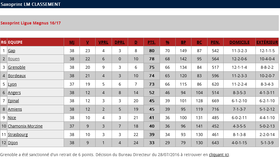 Résultats de la 38ème journée de Saxoprint Ligue Magnus – Vendredi 27 janvier 2017