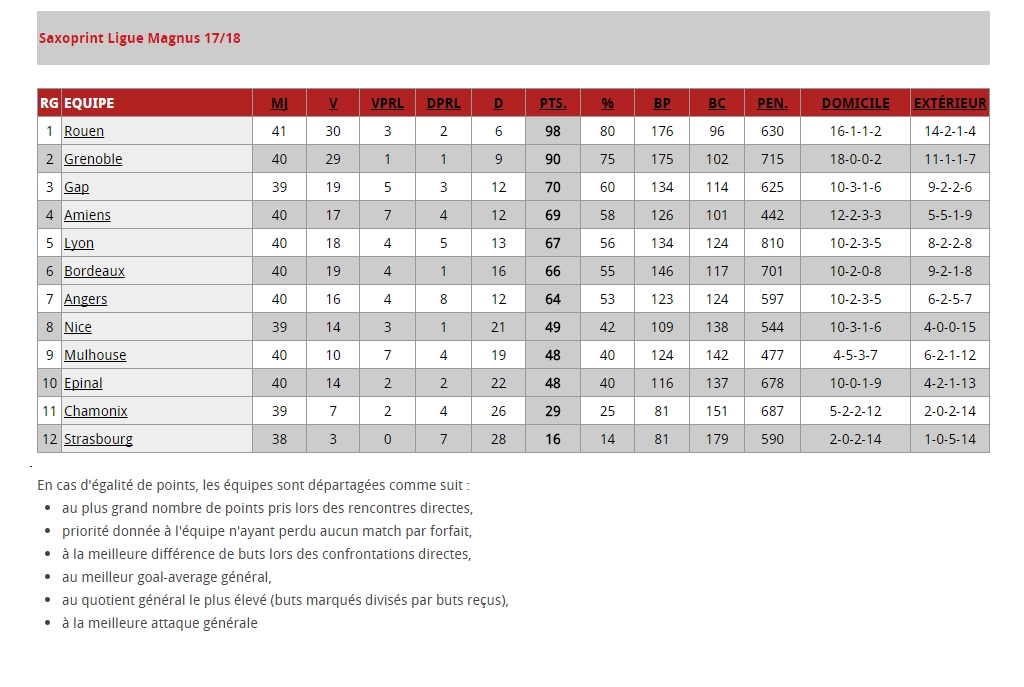 Angers va rentrer un idéalement dans la rencontre en menant rapidement au score au bout de cinq minutes par Danick Bouchard, puis faire le break dans la première période par l’intermédiaire de Brett Sonne. Malheureusement, les Angevins vont se relâcher et Chamonix va en profiter pour mettre plus d’intensité dans leur jeu, ce qui leur permet de revenir au score, puis d’égaliser grâce à un doublé de Henric Hendersen. Dans le troisième tiers-temps, les deux équipes ont l’opportunité de faire basculer le match à son avantage, mais il faudra attendre le money-time, pour que Maxime Lacroix libère les Ducs en inscrivant le but décisif, dans un match aux forceps. A quatre journées de la fin de la saison régulière, de la troisième à la septième la bataille aura lieu jusqu’au bout.