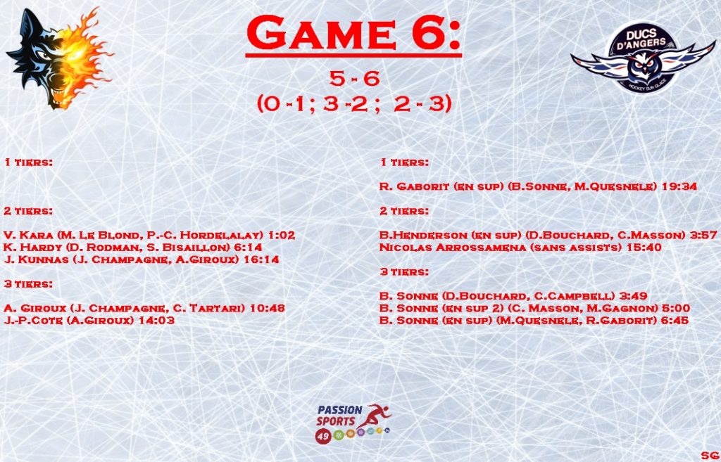 Dans le troisième tiers-temps, les premières offensives sont angevines. Cela leur permet de reprendre l’avantage grâce à un but de Sonne, assisté de Bouchard et de Campbell (3-4, 3’49). Ce but angevin a été validé alors qu’il n’était pas valable… L’équipe de Grenoble est irritée et sort de son match, en se faisant pénaliser doublement. Les Ducs en profitent pour aggraver le score par l’intermédiaire de Sonne, assisté de Masson et de Gagnon (3-5, 5’00). Moins de deux minutes plus tard, les Angevins accroissent leur avance au tableau d’affichage, à travers Sonne, assisté de Quesnele et de Gaborit (3-6, 6’45). Le triplé de Sonne en moins de trois minutes est le tournant du match et locaux ne s’en remettront pas. On pense que le match est plié, mais les hommes d’Edo réagissent et réduisent le score par l’intermédiaire de Giroux, assisté de Champagne et de Tartari (4-6, 10’48). Les Brûleurs de loups font un forcing de plus en plus important, ce qui génère des pertes de palets en zone défensive. La défense angevine craque et encaisse un nouveau but, par Cote, assisté de Giroux (5-6, 14’03). Les Grenoblois continuent d’attaquer jusqu’au bout, mais ne trouveront plus la solution et le chemin des filets. Angers fait la bonne opération en obtenant une précieuse victoire à l’extérieur, face à l’une des grosses cylindrées du championnat.
