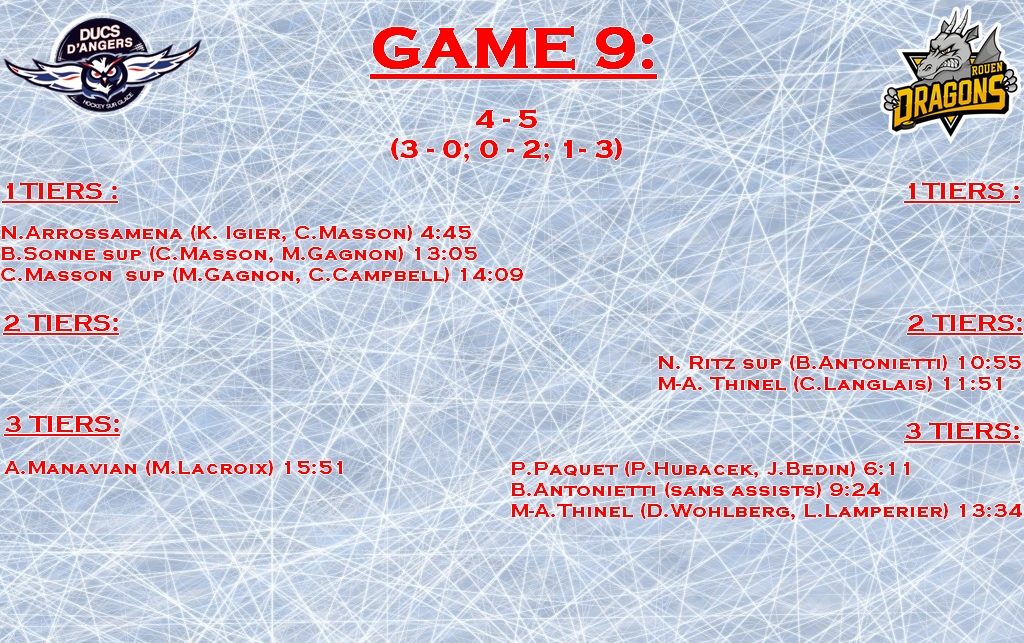 Les Ducs d’Angers se devaient de réagir après leur défaite sur la glace des Aigles de Nice, dimanche dernier (3-4). La tâche s’annonçait pourtant difficile face à une équipe de Rouen en grande forme et sûre de ses forces offensives. Véritable épouvantail du championnat, après huit journées, même en difficulté en début de match, les Rouennais ne se sont pas affolés et se sont imposés sur le fil, face à des Angevins qui auront cru à l’exploit, jusqu’au bout. En effet, après avoir effectué un remarquable premier tiers-temps (3-0), avec plusieurs possibilités d’avoir quatre buts d’avance, les joueurs de Brennan Sonne ont ensuite souffert physiquement et se sont inclinés logiquement sur l’ensemble du match (5-4). Angers va devoir vite régler ses problèmes défensifs, être plus régulier sur l’ensemble d’un match et cela sur soixante minutes. Au classement, après sa victoire à Angers, Rouen s’empare du fauteuil de leader, tandis qu’Angers rétrograde à la neuvième place, en concédant une sixième défaite en neuf matchs.