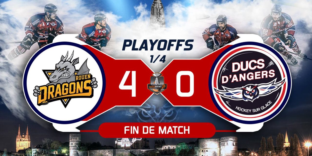 Pour le premier match de la série des quarts de finale de play-offs, Angers se déplaçait à Rouen avec l’objectif de lancer sa série. Malheureusement, après un bon début de match et un bon premier tiers-temps, les Angevins auront craqué dès le premier but encaissé. Un trou d’air fatal pour les Ducs, où les Rouennais iront marquer quatre buts en sept minutes, tuant par la même occasion la rencontre. Les Angevins n’en remettront pas et Rouen frappe fort d’entrée en blanchissant (zéro but encaissé) Angers (4-0). Pas le temps de gamberger pour les Ducs, avec la deuxième confrontation, ce soir, toujours sur la glace rouennaise.