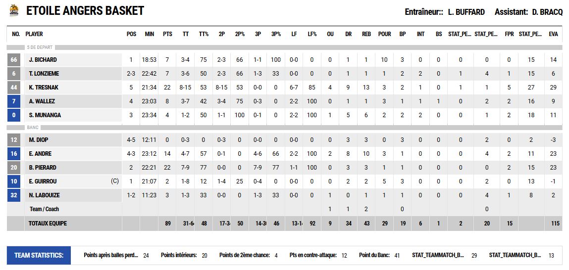 Étoile Angers Basket : Munanga (4), Lonzième (7), Wallez (8), Guirrou (cap.) (2), Diop (0), André (14), Pierard (22), Labouize (3), Tresnak (22), Bichard (7). Entraîneur : Laurent BUFFARD.