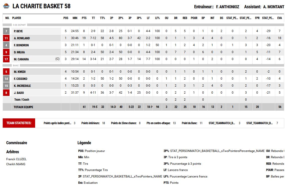 La Charité Basket 58 : Bondron (1), Kwedi (0), Beye (8), Bado (9), Milka (8), Rowland (19), Cissoko (2), Incredule (0), Camara (cap.) (14). Entraîneur : Fabien ANTHONIOZ.