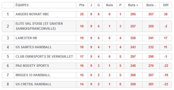 Dans le cadre de la 10e journée du championnat de France de Nationale 1 Masculine, Angers-Noyant HBC se déplace à Lanester, ce samedi. L’enjeu sera double pour Angers, en cas de victoire. D’une, l’accession en poule haute serait presque acquise, et de deux, cela leur permettra d’avoir six points d’avance sur son adversaire, si bien sûr celui-ci montait aussi en poule haute*. A noter, que lors du match aller à Angers, les Noyangevins avaient dominé leur sujet du début à la fin (33-29).